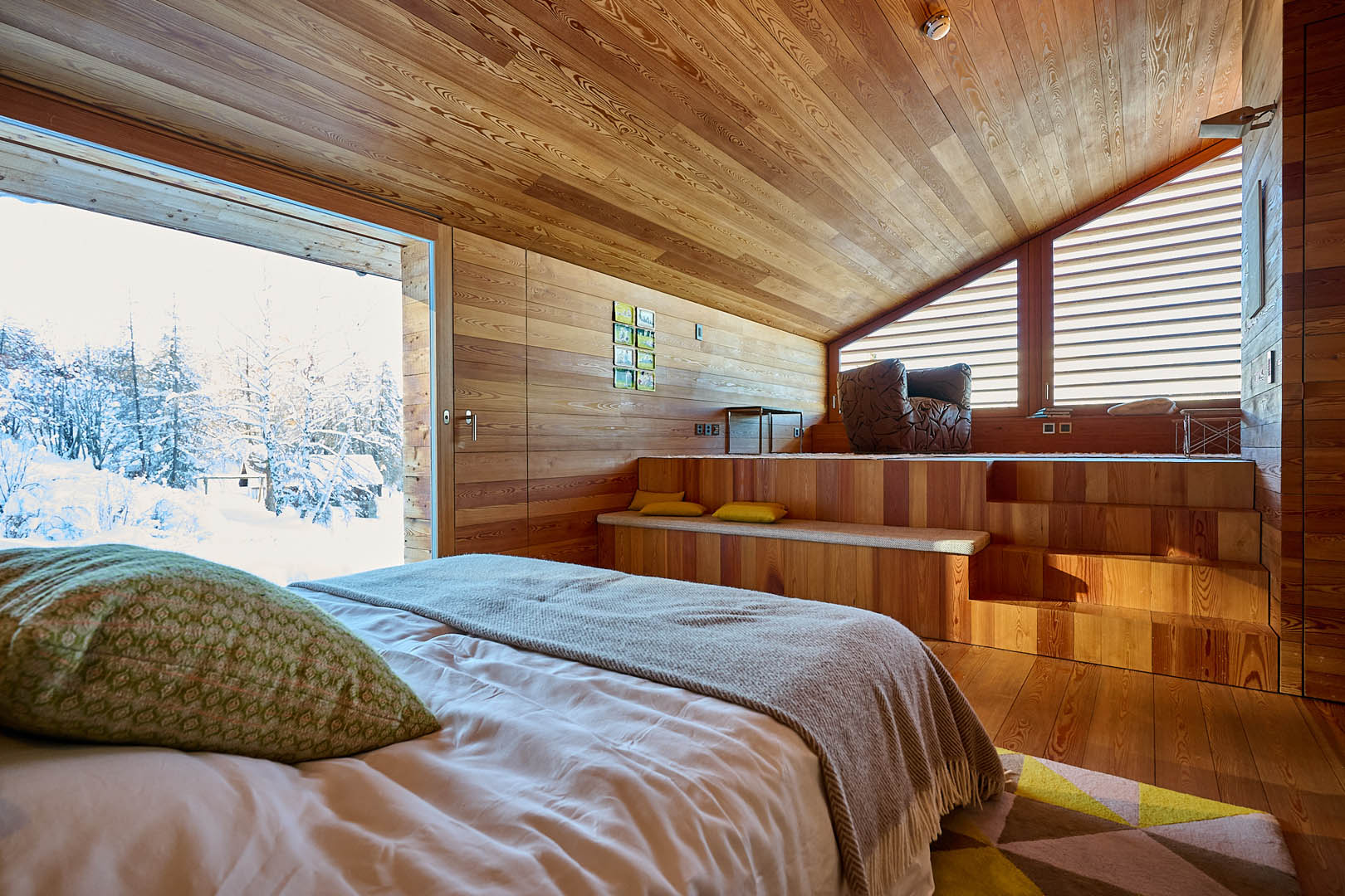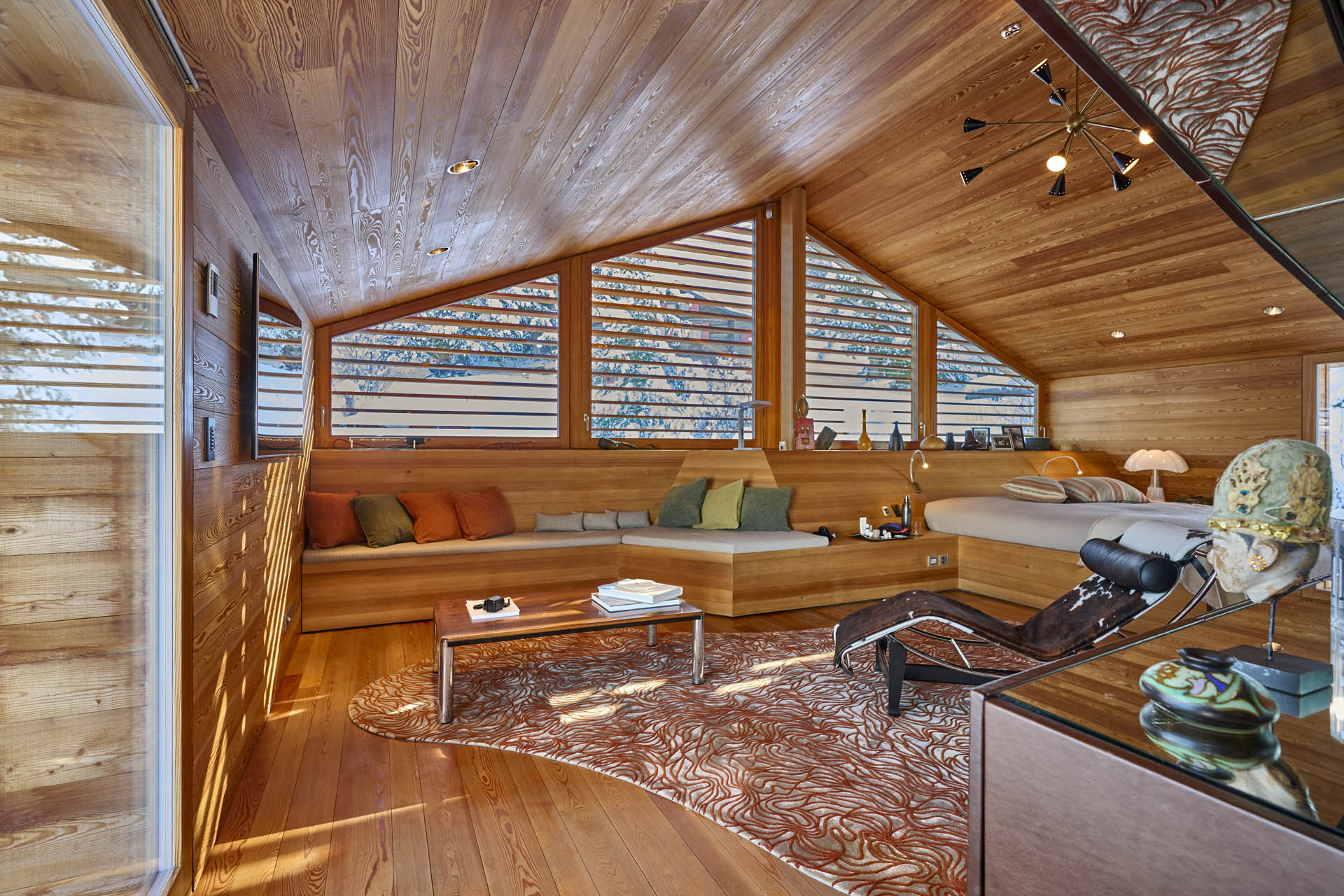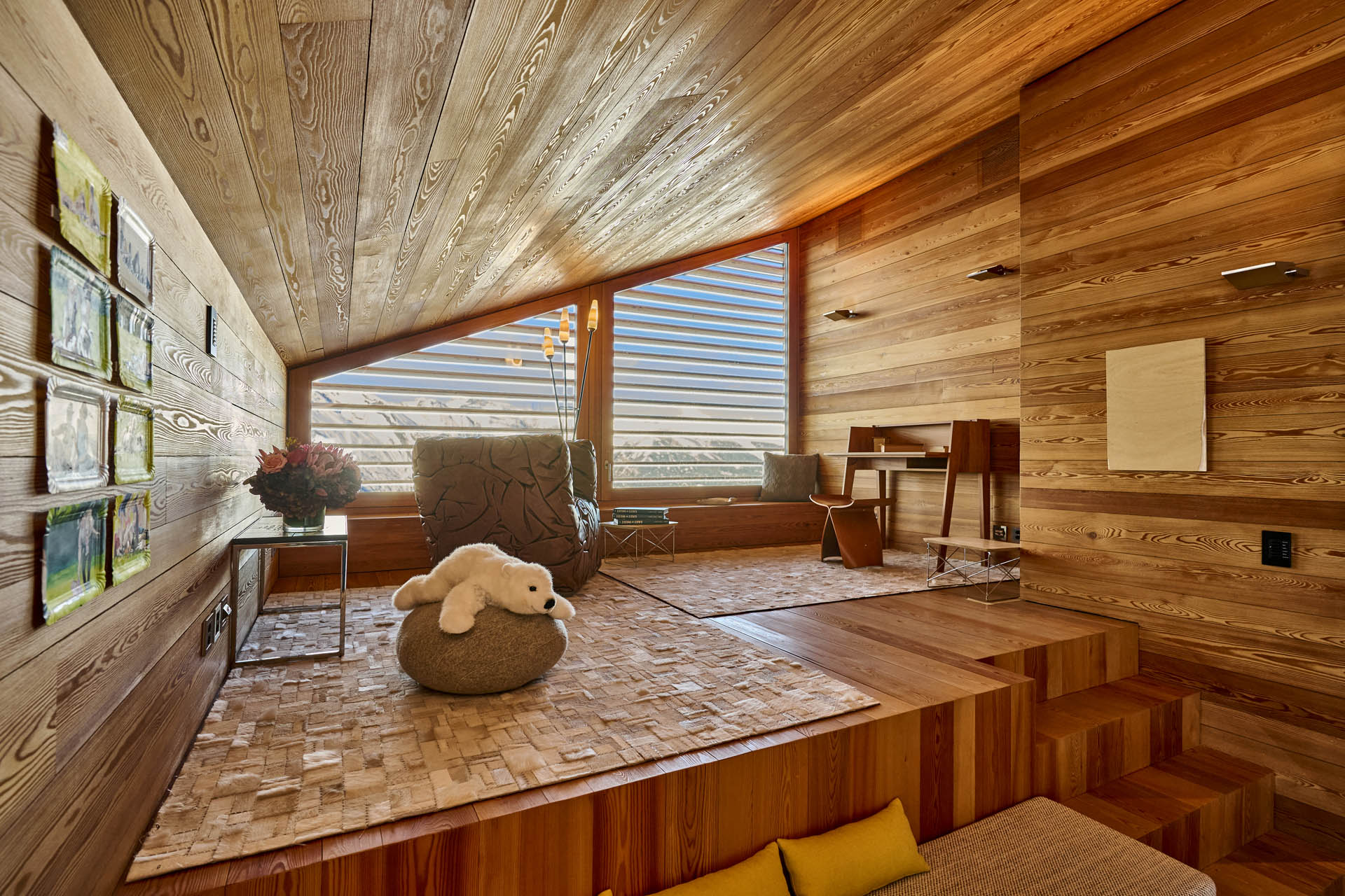 The room blends modern lines with alpine warmth, offering built-in seating, panoramic windows, and a calm atmosphere ideal for reading, resting, or simply enjoying the mountain view.