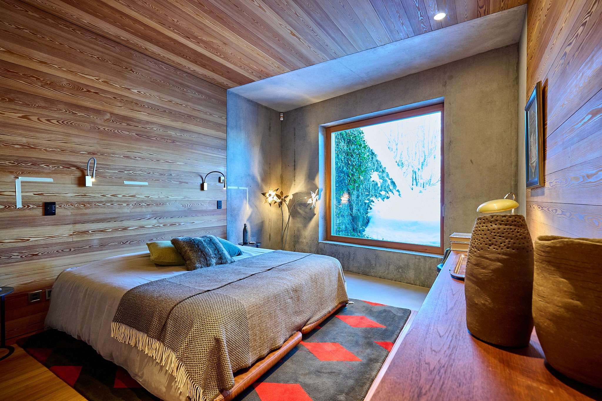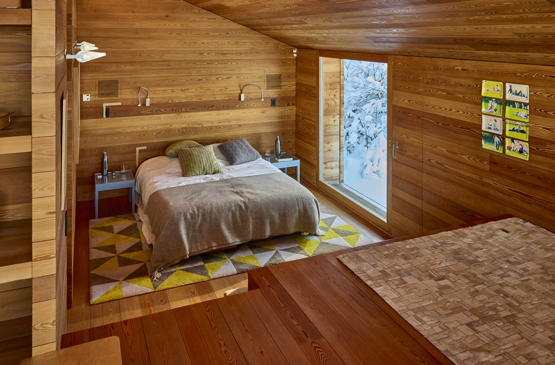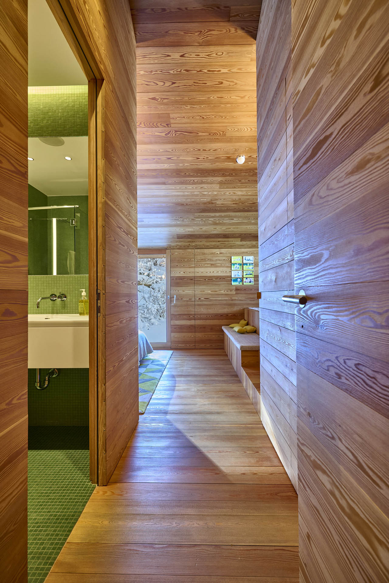The room blends modern lines with alpine warmth, offering built-in seating, panoramic windows, and a calm atmosphere ideal for reading, resting, or simply enjoying the mountain view.