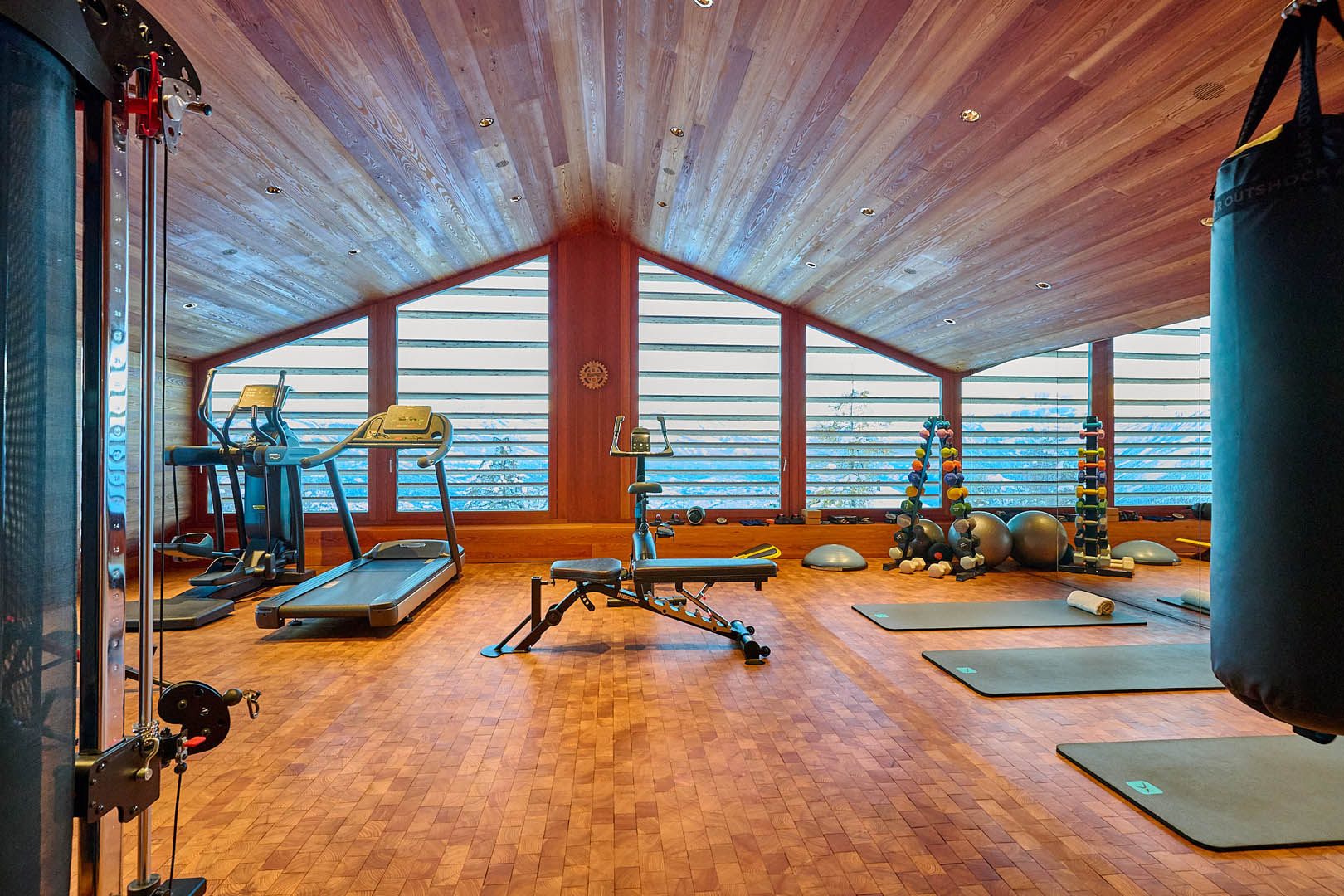 A light-filled fitness space with wide Alpine views, suited for both full-body and cardio training in a private, calm setting