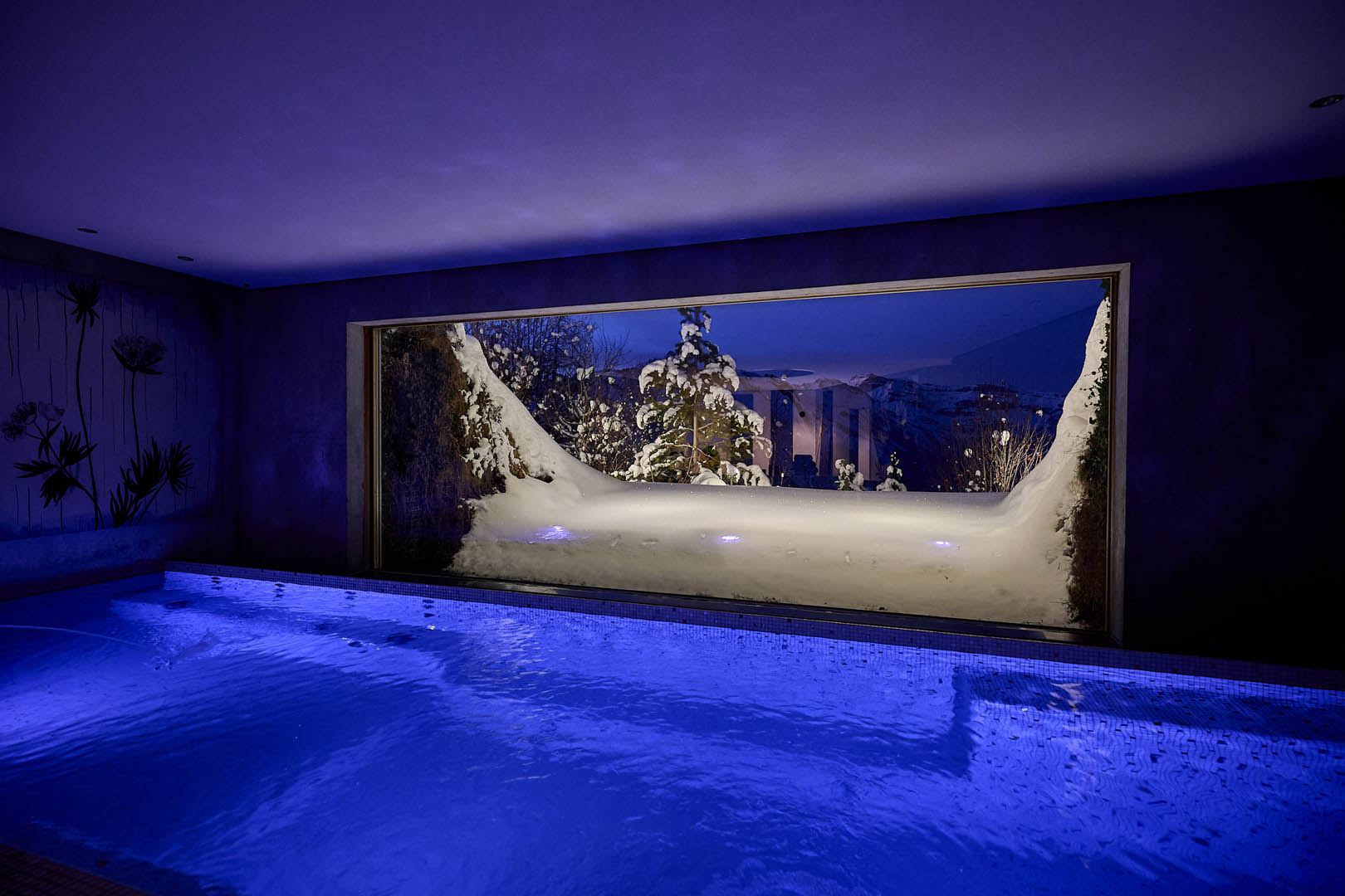 A calm indoor pool with open mountain views, set beside the sauna and hammam for a seamless wellness experience